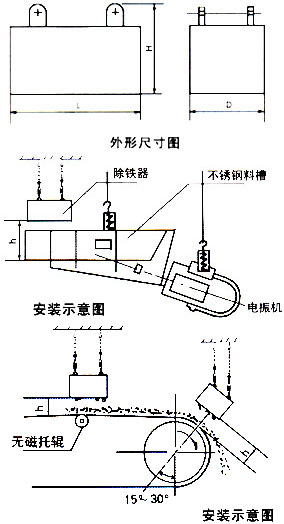 懸掛式永磁除鐵器內(nèi)部采用高矯頑力,高剩磁的特殊永磁體“釹鐵硼”等材料組成復(fù)合磁系。具有免維護(hù)、磁力強(qiáng)、壽命長、安裝簡單、使用方便、運(yùn)行可靠等特點(diǎn),適用于皮帶機(jī)、振動輸送機(jī)、電磁振動給料機(jī)、下料溜槽上的非磁性物料中除鐵。清除0.1~35公斤的鐵磁性物質(zhì),內(nèi)部永磁磁系使用壽命10年以上。該產(chǎn)品各項(xiàng)技術(shù)指標(biāo)符合JB/T8711--1998標(biāo)準(zhǔn)。