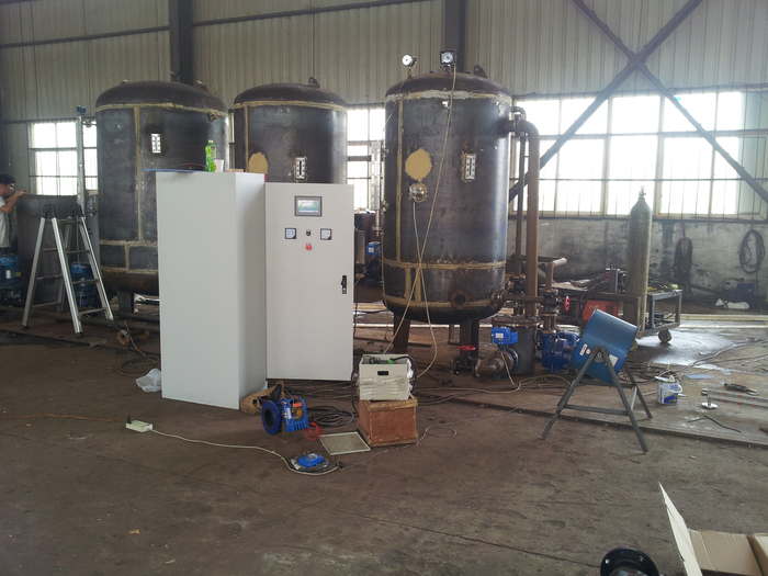新型等量過濾式除氧器的結(jié)構(gòu)形式。它是由(1)外殼(2)旋膜器(3)沖洗裝置(4)快速排污口(6)淋水器(7)不銹鋼蓄熱填料(8)蒸汽等量分配器(9)上封頭及相關(guān)管口焊接制作。 1.外殼:是由筒身和兩個(gè)沖壓橢圓形封頭上下焊接制成。 2.旋膜器:由兩個(gè)水室、旋膜管、凝結(jié)水接管、補(bǔ)充水接管、(3)沖洗裝置(4)快速排污口備用口管組成。 旋膜管是旋膜式除氧器的突出要點(diǎn),旋膜管長度決定除氧器效果好與差。旋膜管上打有直徑4.9mm 的螺旋形狀小孔 10個(gè),設(shè)有計(jì)量的若干個(gè)旋膜管在同等的壓力下做功,水至旋膜管外向內(nèi)壁旋轉(zhuǎn),形成水膜裙,水膜裙象紙一樣薄。容易被蒸汽加熱到飽和溫度,水在旋膜管內(nèi)的做功的時(shí)間是噴霧填料式除氧器的五倍,也就決定了旋膜的理論數(shù)據(jù):起點(diǎn)軸據(jù)為 x mm 。 凝結(jié)水、化學(xué)補(bǔ)水、其它回水經(jīng)旋膜管呈螺旋狀按一定的角度噴出,形成水膜裙,并與加熱蒸汽在旋膜管內(nèi)充分熱交換,加熱蒸汽是由下向上,經(jīng)不銹鋼填料層、淋水器向升把旋膜管的水膜裙加熱到工作壓力下的飽和溫度,除去給水的百分之九十五的氧。 3.淋水器:是由數(shù)層交錯(cuò)排列的角形鋼制件組成,經(jīng)旋膜器粗除氧的給水、疏水在這里混合進(jìn)行二次分配,呈均勻淋雨?duì)盥涞窖b在其下的不銹鋼填料網(wǎng)上。 4.不銹鋼填料層:學(xué)名為蓄熱器,是由相互間隔的扁鋼帶及一個(gè)圓簡體組成,內(nèi)裝一定高度特制的不銹鋼網(wǎng),給水在這里與蒸汽充分接觸,加熱到飽和溫度進(jìn)行深度除氧,以保證除氧水的含量:低壓大氣式除氧器低于≤30ug/L。 改造效益 1臺(tái)50t/h除氧器的整套改費(fèi)用大約需要十萬元左右。 綜合分析1臺(tái)50t/h除氧器每年節(jié)約新蒸汽經(jīng)費(fèi)大約三十萬元人民幣; 改造后除氧器出水溶解氧≤15ug/L,