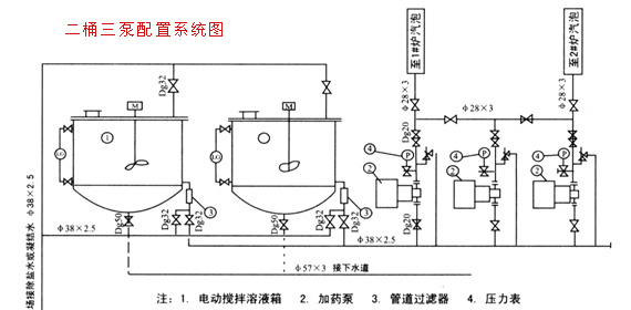 本裝置適用于火力發(fā)電廠300MW及以下機(jī)組氣包內(nèi)加磷酸鹽處理,為二臺(tái)爐用一套設(shè)備,共設(shè)三臺(tái)加藥泵,其中一臺(tái)為備用,為單元制運(yùn)動(dòng)。