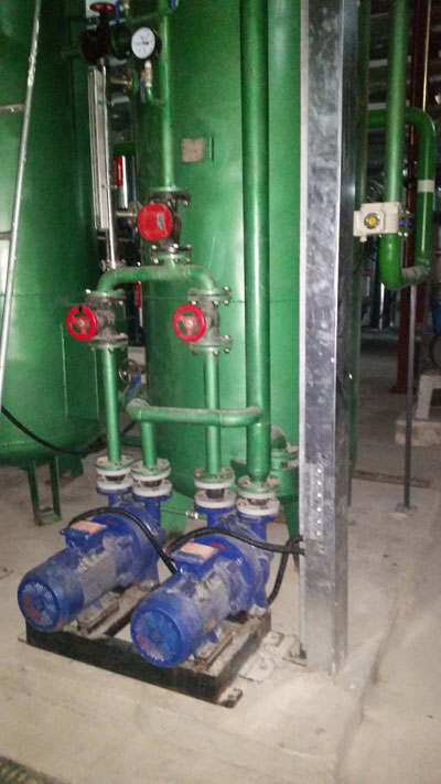 我公司新研發(fā)產(chǎn)品【兩級真空、電化學、化學除氧器】,產(chǎn)品咨詢電話:0518-85215430,13861423563,我公司具有一流的現(xiàn)代化管理技術(shù),與上海復旦大學電力設(shè)計院、中鋼設(shè)計院,中國建材設(shè)計院,中國電力工程顧問集團(西北電力設(shè)計院)、江蘇電力設(shè)計院、山東電力設(shè)計院、浙江電力設(shè)計院等設(shè)計院建立長期友好合作伙伴關(guān)系,共同開拓市場,創(chuàng)造發(fā)展空間。 兩級真空、電化學、化學除氧器概述:鍋爐給水處理工藝過程中,除氧是一個非常關(guān)鍵的環(huán)節(jié)。氧是給水系統(tǒng)和鍋爐的主要腐蝕性物質(zhì),給水中的氧應當?shù)玫綇氐浊宄駝t它會腐蝕鍋爐的給水系統(tǒng)和部件,腐蝕物氧化鐵會進入鍋爐內(nèi),沉積或附在鍋爐管壁和受熱面上,形成難溶的鐵垢,而且腐蝕會造成管道內(nèi)壁出現(xiàn)點坑,阻力系數(shù)增大。管道腐蝕嚴重時,甚至會發(fā)生管道爆管事故。所以國家針對此種工況規(guī)定蒸發(fā)量大于等于2T/H的蒸汽鍋爐,水溫大于等于95℃的熱水鍋爐都必需除氧。多年來眾多鍋爐給水處理工作者一直都在探索,尋找既高效又經(jīng)濟的除氧方法,兩級真空、電化學、化學三為一體的除氧器。適用常溫水除氧,熱水鍋爐除氧,具有其它除氧方法無法比擬的優(yōu)越性,適用性廣泛。 二、兩級真空、電化學、化學除氧器原理 第一步:兩級真空除氧 兩級真空除氧器采用全密閉結(jié)構(gòu),運行期間自始至終處于真空狀態(tài)。給水首先通過電解池進入強旋膜裝置,兩級真空除氧的工作原理是應用亨利定律和道爾頓定律,根據(jù)亨利定律可知 ,在封閉容器中,任何氣體同時存在于水面上 ,則氣體的溶解度與其自己的分壓力成正比 ,而且氣體的溶解度僅與其本身的分壓力有關(guān)。在一定壓力下 ,隨著水溫升高 ,水蒸汽的分壓力增大 ,而空氣和氧氣的分壓力越來越小。在 100℃時 ,氧氣的分壓力降低到零 ,水中的溶解氧也降低到零。當水面上壓力小于大氣壓力時 ,氧氣的溶解度在較低水溫時也可達到零。這樣,水面上空間氧氣分子被析出 ,或轉(zhuǎn)變成其它氣體 ,從而氧的分壓力為零 ,水中氧氣就不斷地逸出,在負壓作用下被除去90%的溶解氧。兩級真空除氧為滿足真空降低沸點,達到除氧效果。 第二步:電化學除氧 整套設(shè)備設(shè)置電解分離缸,電解分離缸是由陽極和陰極組成分解水道,構(gòu)成電解分離總成,水在兩極間通過。 在外接直流電源的作用下, 陽極:鐵板電解失去電子產(chǎn)生二價鐵離子 Fe0 → Fe+2+2e 陰極:氧在陰極得電子產(chǎn)生氫氧根 O2+2e+2H2O→4OH- 水中:電化學產(chǎn)物為: Fe+2+2OH-→Fe(OH)2 第三步:化學除氧 說到化學除氧人們自然聯(lián)想到投放藥劑,而本設(shè)備的第三步化學除氧無需投放藥劑運行,利用了第一步電化學除氧后的產(chǎn)物除氧劑Fe(0H)2再與水中的溶解氧O2反應,達到化學除氧的目的 化學反應方程式: 4Fe(OH)2 +O2+2H2O→4Fe(OH)3顯而易見本除氧設(shè)備在除氧過程中除氧來得迅速、徹底,不但可以除去水中溶解氧,同時可以消除系統(tǒng)中殘余溶解氧。在同一封閉容器中進行了兩級除氧,增強了電化學、化學除氧的可靠性。