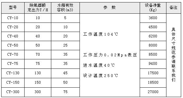 三、旋膜式除氧器型號(hào)、技術(shù)特性及配套參數(shù):CY-新型旋膜式除氧器